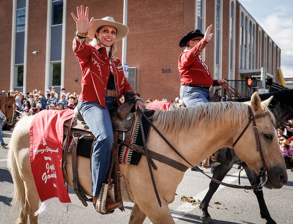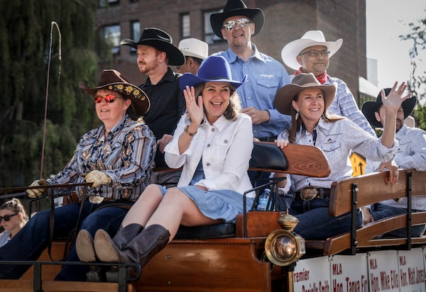 Alberta Premier Danielle Smith, centre, waves from a float during the Calgary Stampede parade on Friday. Every year, political and financial worlds collide at the event celebrating Western culture.Jeff McIntosh/The Canadian Press