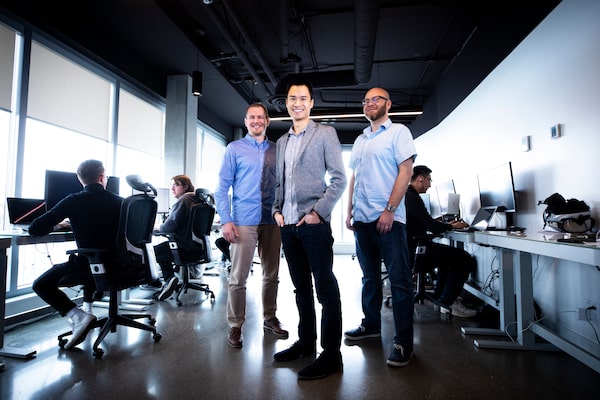 Neo Financial CEO and co-founder Andrew Chau, centre, with co-founders Jeff Adamson, left, and Kris Read at Neo's headquarters in Calgary.Todd Korol/The Globe and Mail