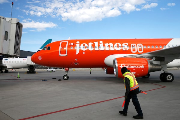 A Canada Jetlines Airbus A320 jet pulls up to a gate at Calgary airport on the airline's inaugural flight, on Sept. 22.Larry MacDougal/The Canadian Press