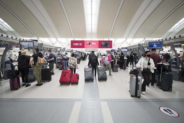 Travellers at Toronto Pearson Airport’s Terminal One in May 2022. A spokesperson for the GTAA, which runs Pearson, said the hike in aeronautical fees is needed to keep up with the debt payments, inflation and economic uncertainty that came with pandemic shutdowns.Fred Lum/the Globe and Mail