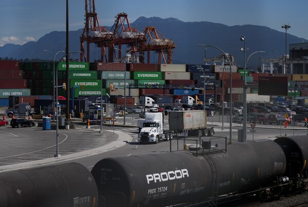 Transport trucks carry cargo containers at the port in Vancouver in 2023. Canada's surprise bounce back in third-quarter GDP was led by a large swing in its trade balance.DARRYL DYCK/The Canadian Press