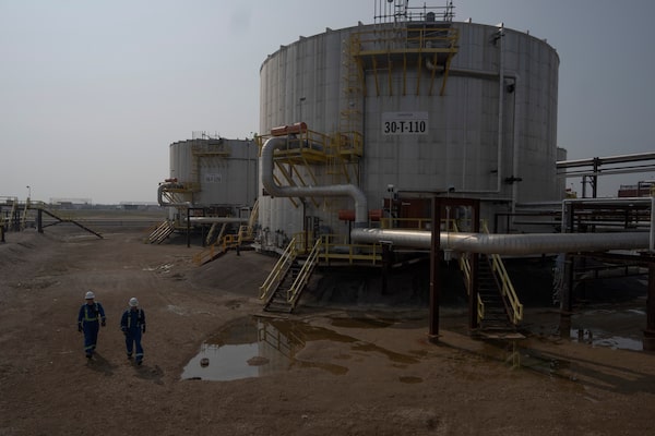 Workers walk by crude oil tanks at Cenovus' Sunrise oil facility northeast of Fort McMurray, Alberta, in 2023.Victor R. Caivano/The Associated Press