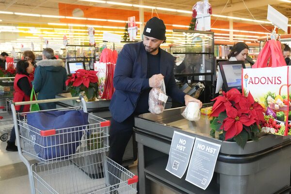 A customer stands at a check out counter displaying a sign noting the temporary HST/GST freeze at the Adonis grocery store in Mississauga, Ont. on Monday, December 16, 2024.Chris Young/The Canadian Press