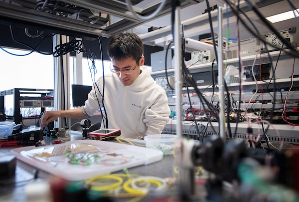 Senior scientist Tomohiro Nakamura works in the lab at Xanadu Quantum Technologies’ Toronto office on Sept 8. Xanadu’s technology utilizes qubits, tiny superconducting circuits, coded into flashes of laser light – an approach that lessens the demand for cryogenic cooling.Fred Lum/The Globe and Mail