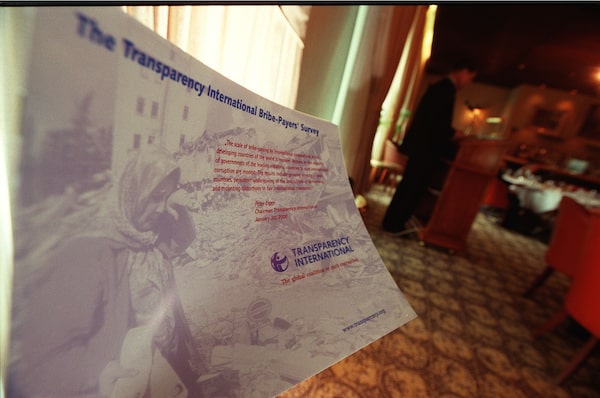 Transparency International, which rated 44 leading exporters, said it found that “only 11 major exporting countries − accounting for about a third of world exports − have active or moderate law enforcement against companies bribing abroad in order to gain mining rights, contracts for major construction projects, purchases of planes and other deals.”