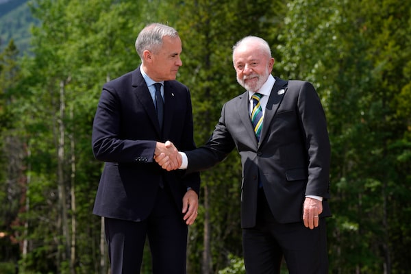 Mark Carney greets Luiz Inacio Lula da Silva at the G7 Summit in Kananaskis, Alta., in June 2025. Mr. Carney is said to have accepted an invitation to visit Brazil in April.Adrian Wyld/The Canadian Press