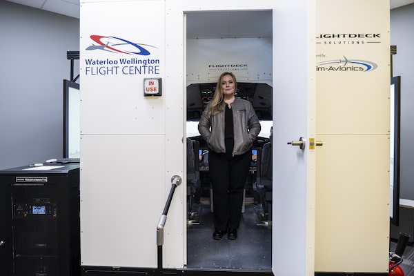 Dr. Suzanne Kearns poses for her portrait in a flight simulation in Hangar 7 at the Region of Waterloo International Airport in Breslau, Ont., on Dec. 19. Kearns is an Associate Professor at the University of Waterloo and the Founding Director of the Waterloo Institute for Sustainable Aeronautics.Alicia Wynter/The Globe and Mail
