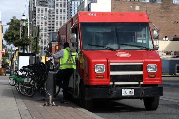 A Canada Post carrier leaves his truck in downtown Toronto. The Crown corporation is encouraging the public to give mail carriers a thumbs-up to show their appreciation, rather than approaching them during the coronavirus pandemic.Colin Perkel/The Canadian Press