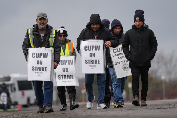 Members of the Canadian Union of Postal Workers picket outside a processing centre in Richmond, B.C., on Nov. 27.DARRYL DYCK/The Canadian Press