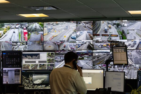 A worker at the Port of Vancouver's operations hub oversees a wall of TV monitors showing live feed cameras at various points around the port.Jesse Winter/The Globe and Mail