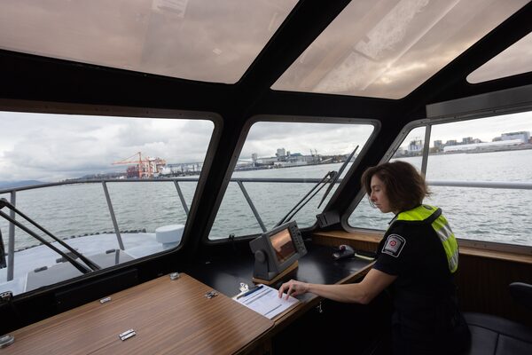 Harbour Patrol Officer Aubrey Pedersen (top) works aboard a Port of Vancouver patrol boat on Burrard Inlet in October, 2024. The port has 23 major terminals along the inlet, and cargo imports and exports also move from areas nearby, including terminals in Delta, B.C.Jesse Winter/The Globe and Mail