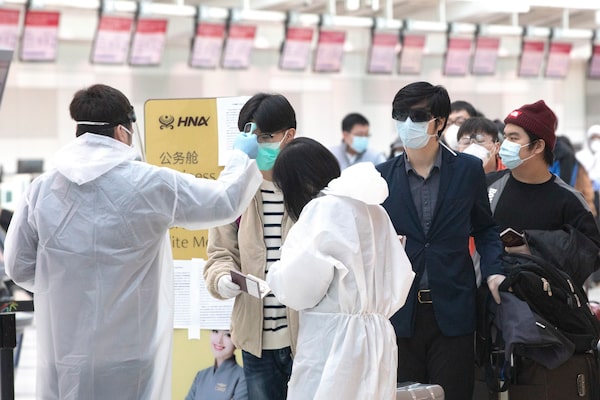A passenger is screened before checking into a flight to Shanghai from Toronto's Pearson Airport, on Friday, March 27, 2020.Chris Young/The Canadian Press