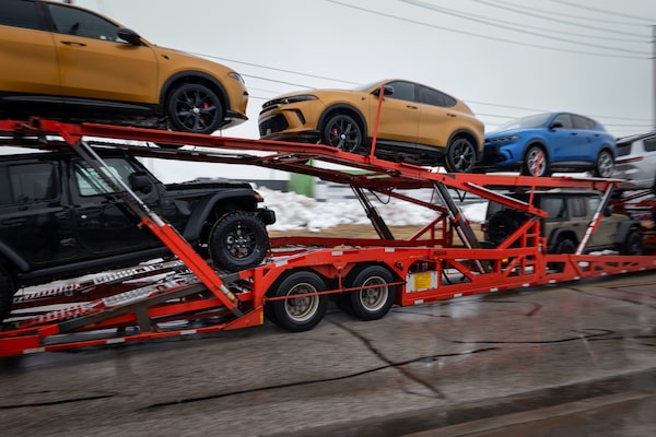 A truck transporting finished vehicles from the Stellantis plant in Windsor, on Jan. 31. Industry experts say Canada's auto sector could experience great disruption as a result of Trump's latest tariffs.Ian Willms/The New York Times News Service