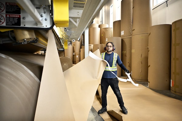 A CanCorr employee works on the production floor on March 21. At the highest level, some of the industry’s biggest members are pivoting and working together to avoid increased costs and keep production in-house.Jennifer Gauthier/The Globe and Mail