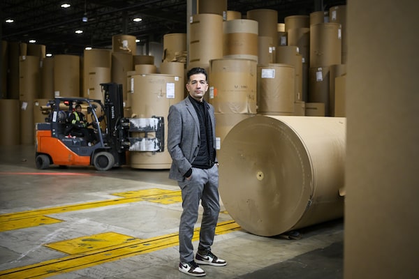 Baha Naemi, co-founder of CanCorr, walks the production floor of the corrugated sheet manufacture's facility in Surrey, B.C., on March 21. Companies across the supply chain, from paper to corrugated sheets to boxes, are feeling the weight of an impending price increase. due to tariff increases.Jennifer Gauthier/The Globe and Mail