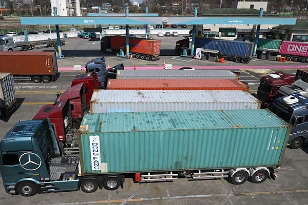 Trucks are parked in front of a petrol station of an Inland Container Depot terminal in Uiwang, South Korea, on Friday.JUNG YEON-JE/AFP/Getty Images