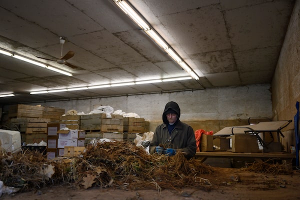 Russell Alder grades and prepares asparagus root stock for packaging at Charles Keddy Farms in the Annapolis Valley, N.S. on April 1, 2020. In a normal year, farmer Philip Keddy said there would be 10 other workers sorting asparagus and strawberry plants for shipment.Darren Calabrese/The Globe and Mail