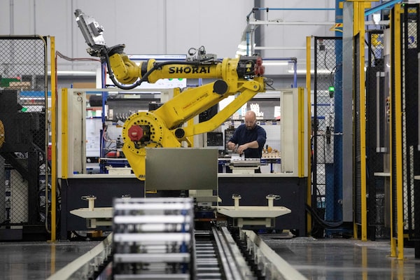 A factory worker works on an aircraft part at Abipa Canada, in Boisbriand, Que., in 2023.EVAN BUHLER/Reuters