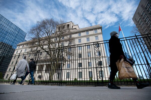A pedestrian wearing a face mask walks past the Manulife head office in Toronto on April 5, 2020.Fred Lum/the Globe and Mail