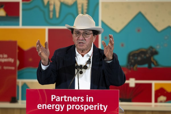 Chief Roy Fox, Makiinima, of the Kainai First Nation speaks during a press conference at TC Energy Tower in Calgary on July 30.Gavin John/The Globe and Mail