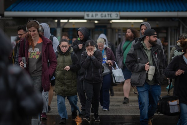 Auto workers leave the Stellantis Windsor Assembly Plant in Windsor, Ont., on April 2.Dax Melmer/The Globe and Mail
