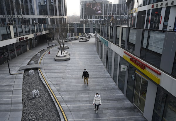 A Chinese couple wear protective masks as they walk in an empty shopping area that would usually be busy during the Lunar New Year holiday, on Jan. 28, 2020, in Beijing, China.Kevin Frayer/Getty Images
