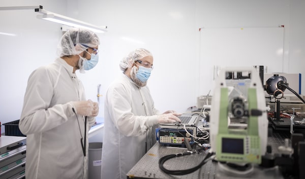 Jean-Michel Fortin, engineer at ABB, and Karl Lafontaine, technician at ABB, perform tests on a GHGSat C02 detector at the ABB facility in Quebec City on March 17.MATHIEU BELANGER/The Globe and Mail
