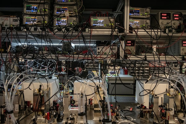 A series of three optical units, below, form the heart of the Borealis quantum computer developed by Toronto based Xanadu Quantum Technologies Inc. Each unit splits and reroutes pulses of laser light to form a network of entangled light particles that collectively perform a mathematical calculation.Galit Rodan/The Globe and Mail