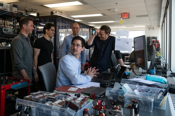 Quantum physicists (left to right) Fabien Rortais, Mohsen Falamarzi Askarani, Lars Madsen, Jonathan Lavoie and Fabian Laudenbach share a laugh at Xanadu Quantum Technologies Inc. in Toronto. Behind them is Borealis, one of the first quantum computers in the world to demonstrate an advantage over conventional computer systems.Galit Rodan/The Globe and Mail