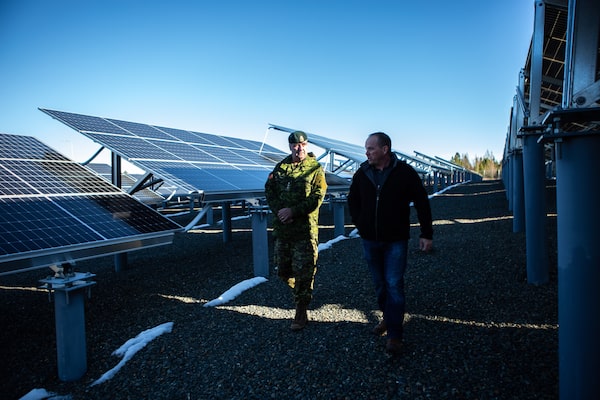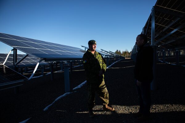 Captain Peter Ryan, left, in a solar panel field at CFB Gagetown, in New Brunswick, on Nov. 29, 2022.Chris Donovan/The Globe and Mail