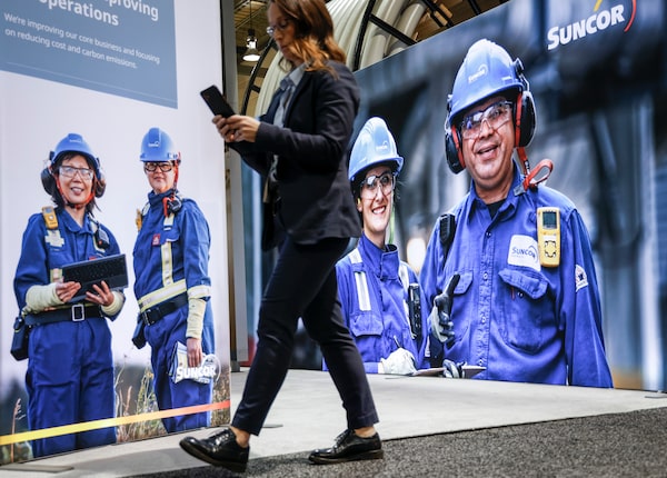 Delegates walks past an image of oil workers at the World Petroleum Congress in Calgary on Sept. 18. Oil sands companies that are part of the Pathways Alliance are aiming to spend more than $24-billion on emission-reduction projects by 2030.Jeff McIntosh/The Canadian Press