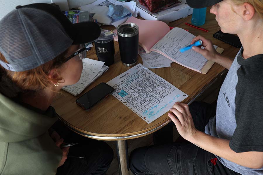 Because of the muddy fields early in the season, there was a surge in calls for the company’s fungicide spraying service for all types of crops, including wheat and canola. Rivers Air had to contend with a surge in fuel prices, forcing the company to add a 15-per-cent fuel surcharge. Photo: Stefanie and Cassandra Lepp plot out aerial spray runs.