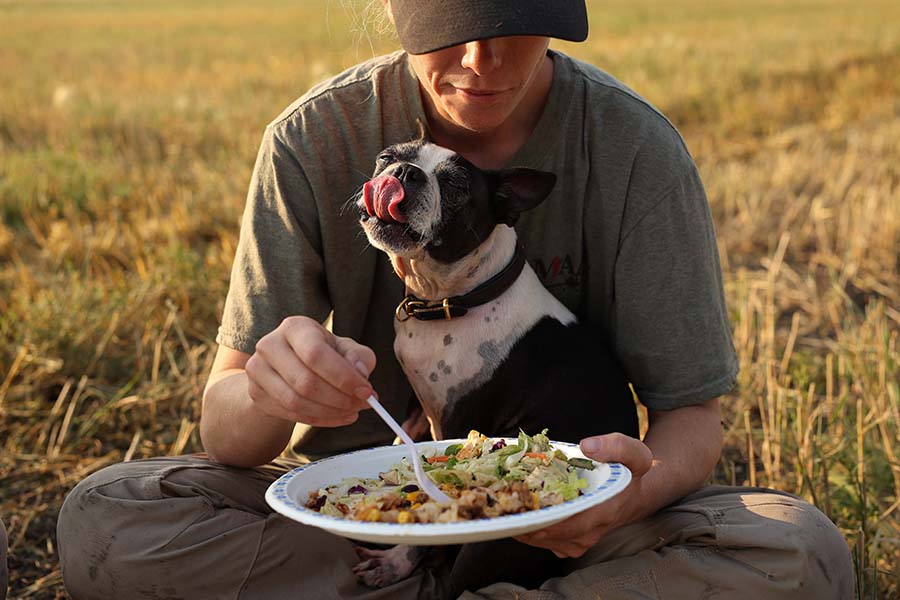 In mid-May, with heavy rains delaying the start of seeding, the Lepp sisters and other young farmers from the area gathered for dinner and drinks to console each other. “We got together for moral support because it was really scary,” Cassandra said. “I’ve farmed for 15 years and never started as late as we did this year.” In the end, the family got 70 per cent of the barley crop they had wanted, which Cassandra said she was happy about, considering the rough start. Photo: Cassandra Lepp eats dinner with her dog Piper during a brief pause in the family's harvest on an early September evening.