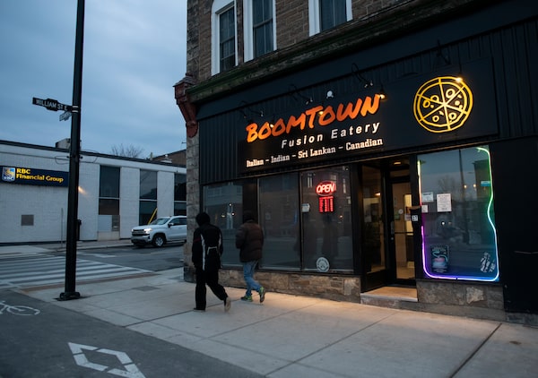 Boomtown Fusion Eatery, a restaurant serving Italian, Indian, Sri Lankan and Canadian cuisine in Smiths Falls, Ont., on Feb 13. The restaurant opened during the pandemic and was named Boomtown in reference to communities that experience sudden growth in business and population.Fred Lum/The Globe and Mail