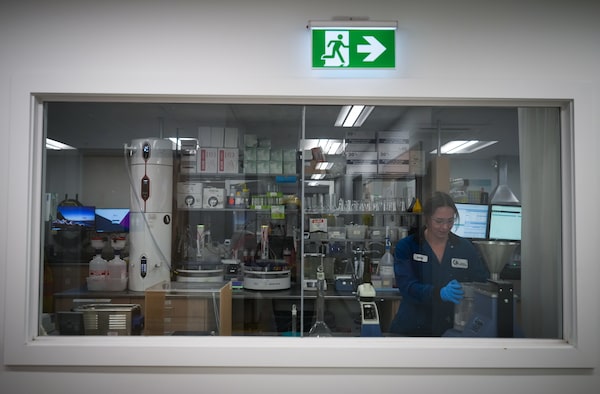 Top, Carbon Engineering's direct air capture pilot plant in Squamish, B.C. Bottom, lab technician Annika Brickwood tests samples in the plant's lab.DARRYL DYCK/The Globe and Mail