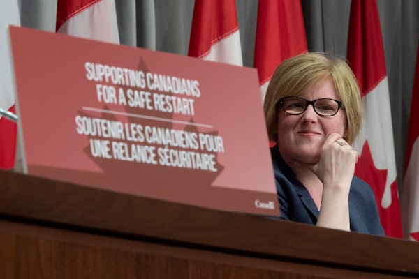 Employment, Workforce Development and Disability Inclusion Minister Carla Qualtrough listens to a question during a news conference on Aug. 20, 2020 in Ottawa.Adrian Wyld/The Canadian Press