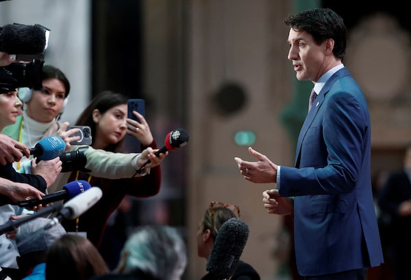 Prime Minister Justin Trudeau addresses journalists as he arrives for an AI summit in Paris on Feb. 11. Tensions with the U.S. could affect Canada’s goal of building more infrastructure to support AI.Benoit Tessier/Reuters