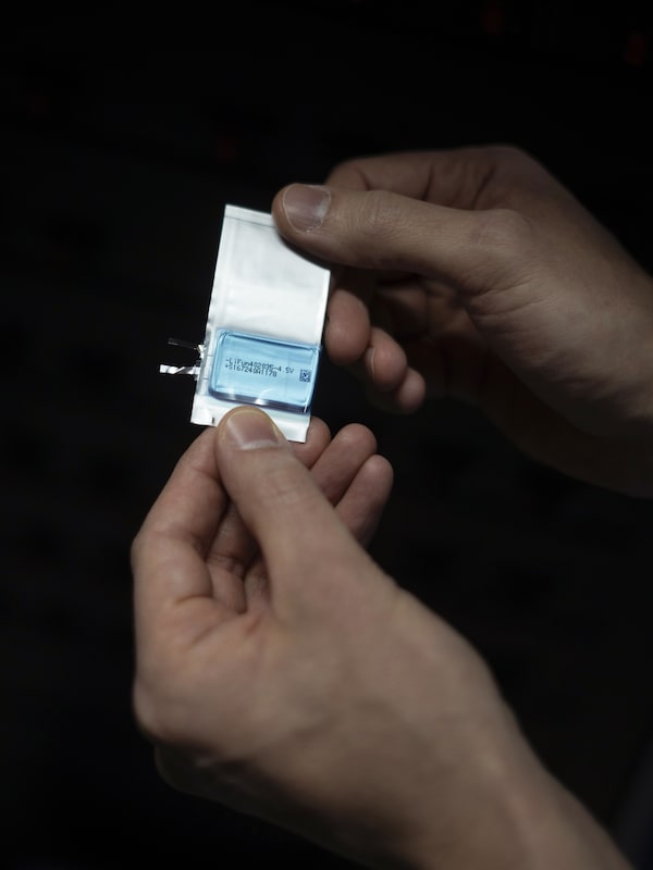 Researcher Michael Metzger holds a prototype battery cell at the Dalhousie University battery testing lab.Darren Calabrese/The Globe and Mail