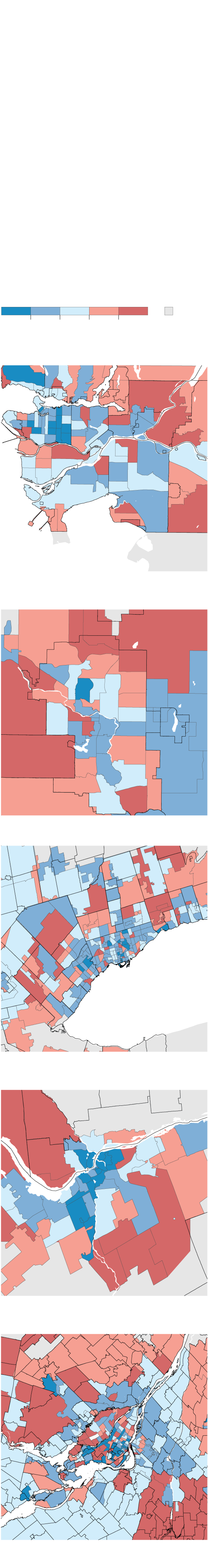 While pandemic restrictions have lifted and fewer people are working remotely from home full time, the return to the workplace is far from even within cities, let alone across the country. Using anonymized, privacy-compliant data from mobile devices, as well as neighbourhood demographics and business data, Environics Analytics calculated the aggregate change in the number of days spent at workplaces in Canada’s five largest metropolitan areas between January, 2020, before the pandemic hit, and July, 2022. The maps show the change broken down by the first three characters of postal codes. Blue shades represent neighbourhoods where aggregate time spent at workplaces is below the pre-pandemic level, while red shades show those places that have matched or exceed it.