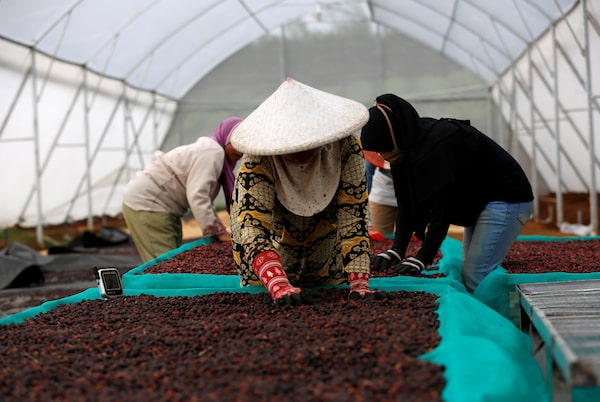 Workers dry arabica coffee cherries at a coffee mill in Pangalengan, Indonesia, in 2018.DARREN WHITESIDE/Reuters