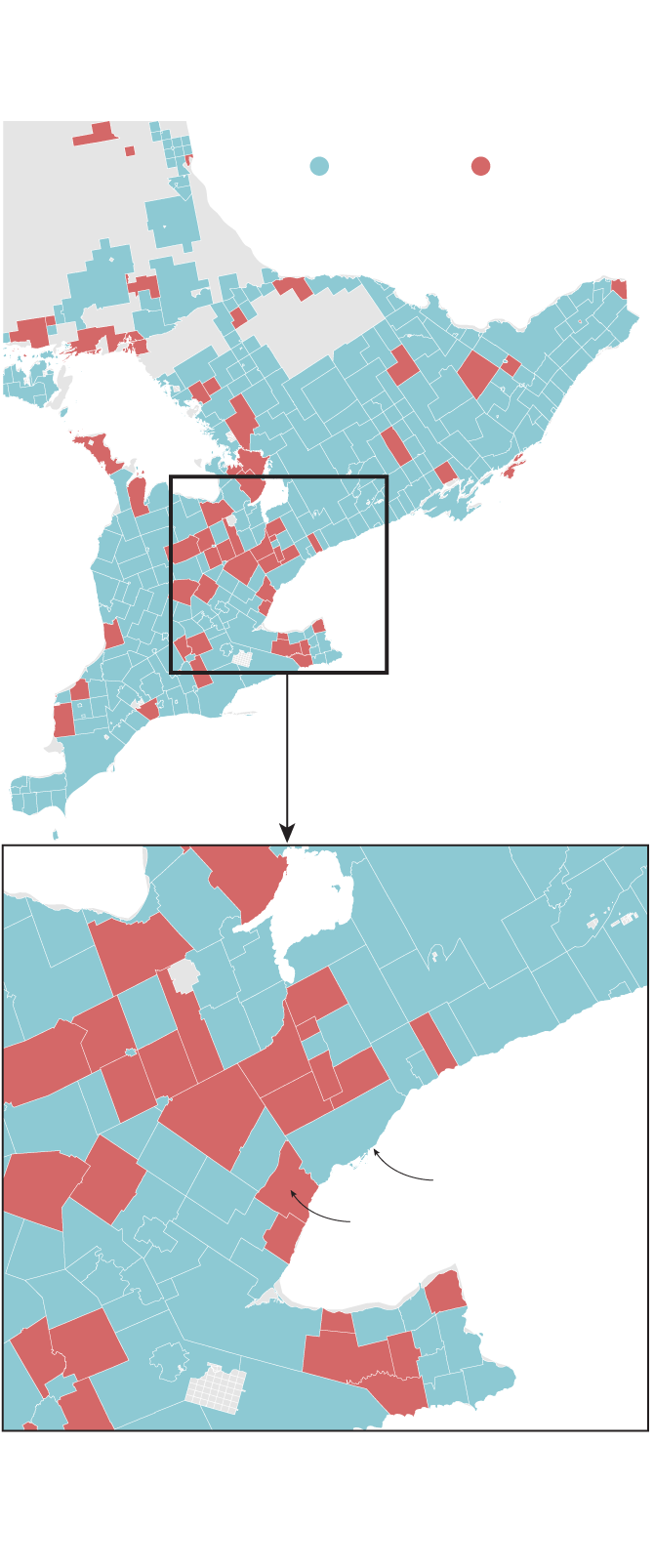 Note: Grey areas include First Nations, provincial and national parks, and places for which there are no data