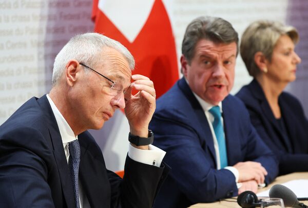 Chairman of the Board of Directors of Credit Suisse, Axel Lehmann, left, attends a news conference on Credit Suisse after UBS Group's US$3.25-billion takeover, in Bern, Switzerland, March 19.DENIS BALIBOUSE/Reuters