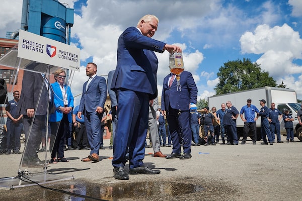 Premier Doug Ford empties a bottle of Crown Royal whisky at a press conference in Kitchener, Ont., on Tuesday.Sammy Kogan/The Canadian Press