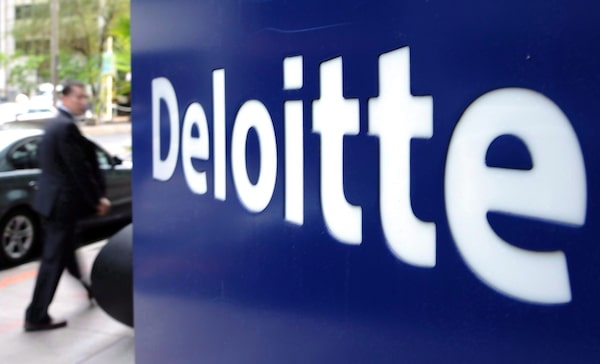 Pedestrians walk past a Deloitte sign in downtown Ottawa on Sept. 20, 2011.Sean Kilpatrick/The Canadian Press
