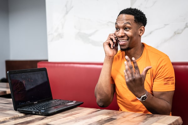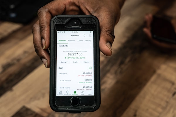 At his friend's restaurant in Silver Spring, Md., Brandon Battle checks his trading chart and sees that he's made a profit. Mr. Battle, 34, taught himself how to trade stocks during the pandemic.Dee Dwyer/The Globe and Mail