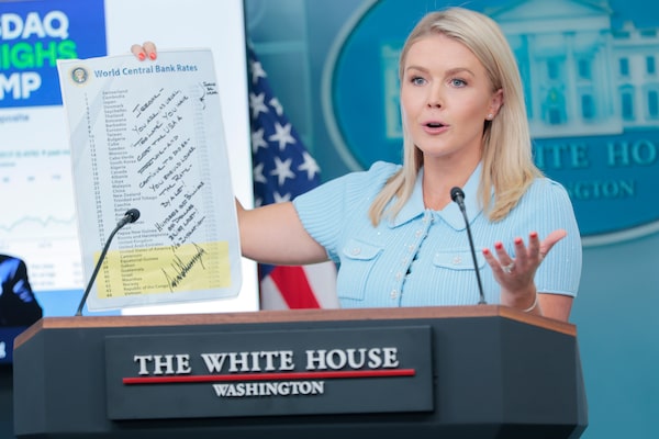 White House press secretary Karoline Leavitt holds up a handwritten note to U.S. Fed Chair Jerome Powell from U.S. President Donald Trump at the White House on Monday.Anna Moneymaker/Getty Images