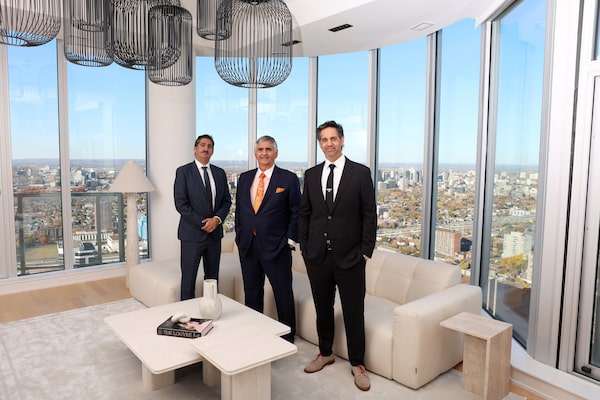 Claridge Homes founder Bill Malhotra, centre, with sons Neil, left, and Shawn in the penthouse of one its buildings, Icon condo in Ottawa.Dave Chan