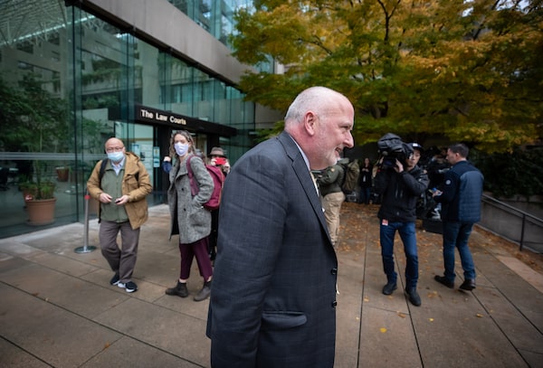 Lawyer Ken McEwan, who is representing Edward Rogers, leaves B.C. Supreme Court in Vancouver, on Friday, Nov. 5, 2021. With the judge ruling in favour of Mr. Rogers, he is once again chair of the telecom and media giant’s board of directors.DARRYL DYCK/The Canadian Press