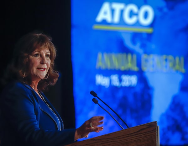 ATCO chief executive officer Nancy Southern addresses the company's annual meeting in Calgary on May 15, 2019. Discussions around emissions reduction and environmental, social and governance factors have grown massively since Southern became CEO 20 years ago,Jeff McIntosh/The Canadian Press