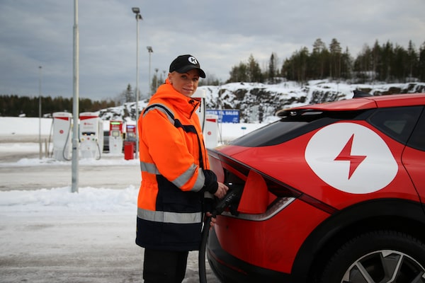Lindy Haukedal, manager of the Circle K Bamble station in Norway, charges a car on Feb. 6.Nathan Vanderklippe/The Globe and Mail